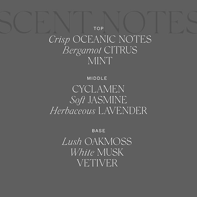 - Ocean ozonic saltwater notes blend with soft jasmine lavender and bergamot Soft warm notes of white musk and lush oak moss