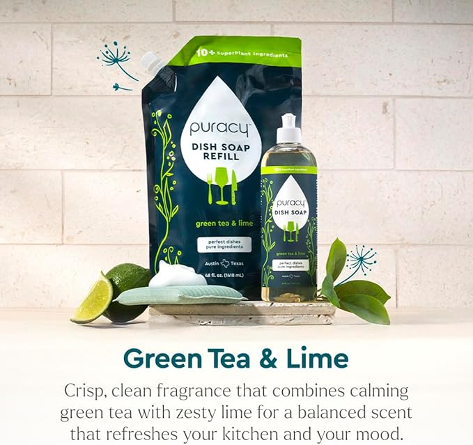 Puracy Natural Dish Soap Packs- Skin-Softening Plant-Based Dishwashing Soap, Non-Toxic Dish Soap, Organic Liquid Dishwashing Detergent Soap (Green Tea & Lime, 16 fl oz, 3 Pack)