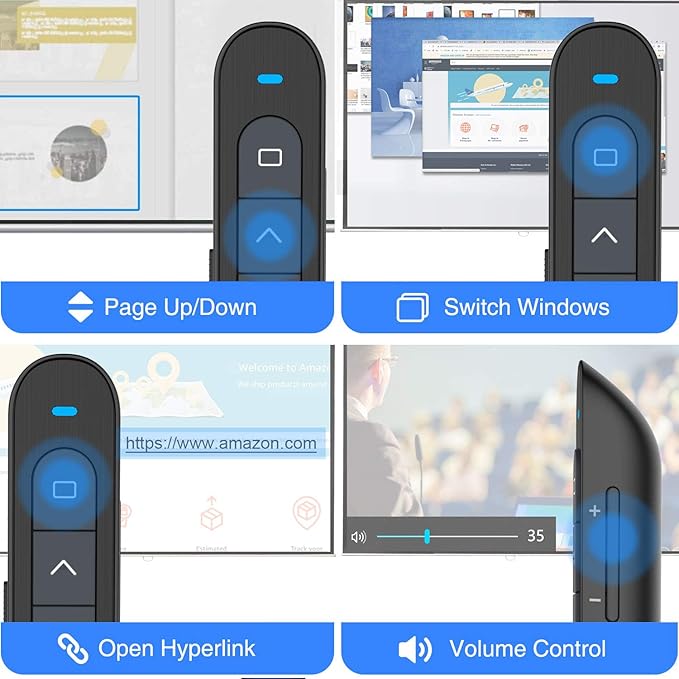 - Plug & Play and Portable Design - The wireless presentation remote is plug & play without installing any software. Compatible with Windows, macOS, Android, Linux and leading presentation software like PowerPoint, Prezi, Keynote, Google Slides etc
