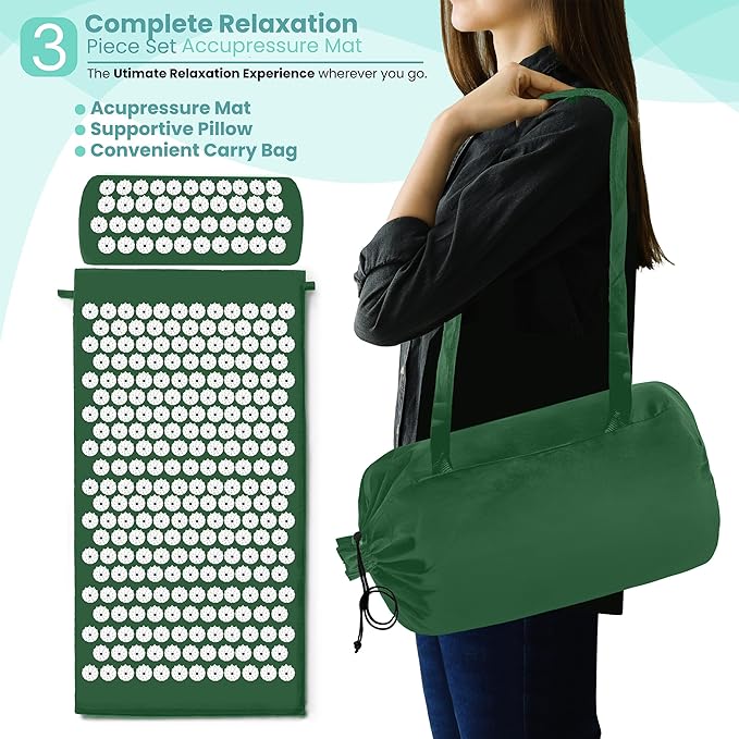 Sivan Back and Neck Pain Relief Acupressure Mat and Pillow Set, Chronic Back Pain Treatment - Relieves Your Stress of Lower Upper Back and Sciatic Pain - Green