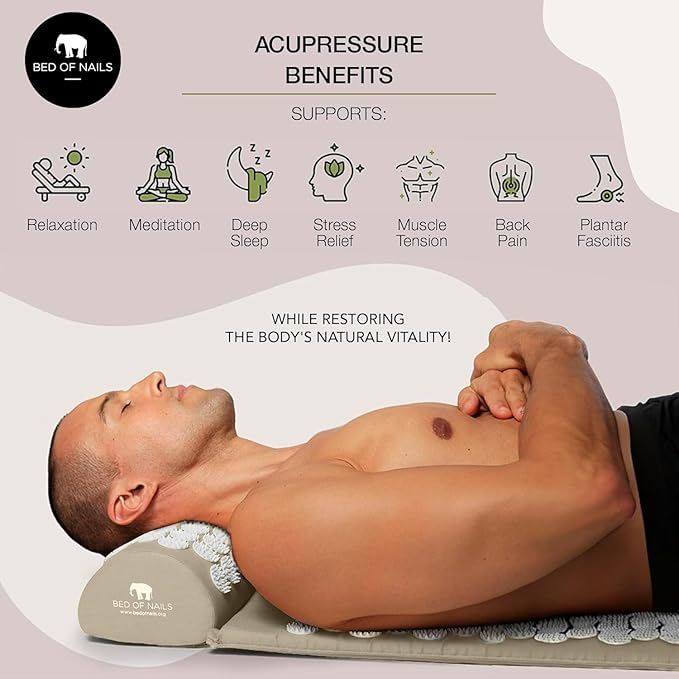 - BED OF NAILS BENEFITS: Our acupuncture flat cushion pillow does not penetrate the skin, but instead supports relaxation, meditation, deep sleep, stress, muscle tension, upper and lower back pain, plantar fasciitis, and more, as the body restores natural vitality, making this a great addition to your beauty tools arsenal. The pillow can also be used to target treatment zones, tension headaches, migraines, reflexology zone therapy for feet, or as a lumbar support for head, neck and back