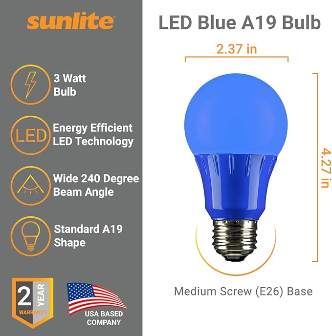 - CLASSIC SHAPE – Sunlite’s LED light bulb is the perfect option for your space when you are looking to add some flare with a colorful light. With a common A19 shape and medium (E26) base they can be used to upgrade any standard fixture or lamp in your home