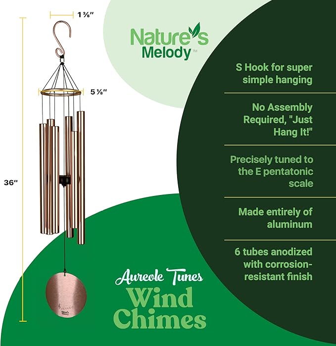 Nature’s Melody Aureole Tunes Wind Chimes – Outdoor Windchime with 6 Tubes Tuned to E Pentatonic Scale, 100% Rustproof Aluminum, Powder Finish & S Hook Hanger for Sympathy, Memorial Gift or Zen Garden