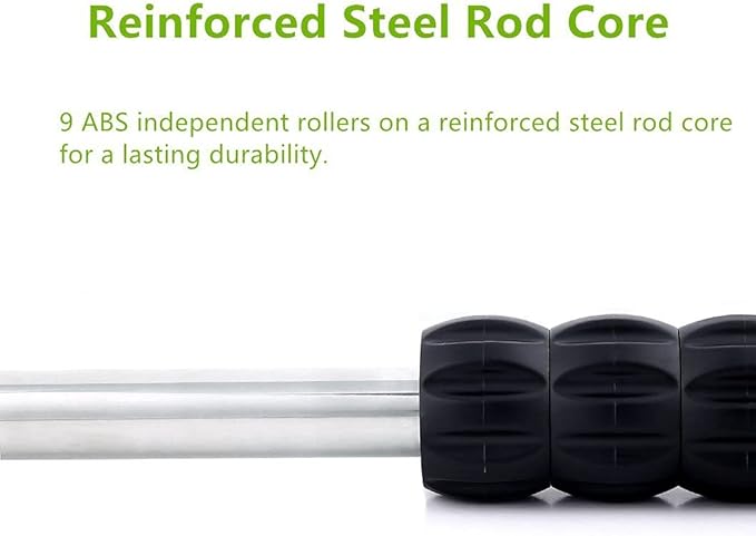 - DURABLE & HIGH QUALITY MATERIALS: This massage stick roller is made with industrial strength materials, thermoplastic rubber and polypropylene handles for comfort and grip, 9 ABS independent rollers on a reinforced steel rod core for a lasting durability.