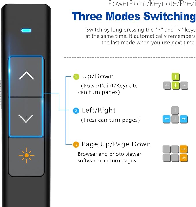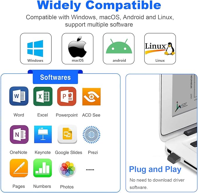 - Wide Compatibility - This pointer for presentations is compatible with Windows, macOS, Linux, Android and leading presentation software like PowerPoint, Keynote, Prezi, Google slides and more.