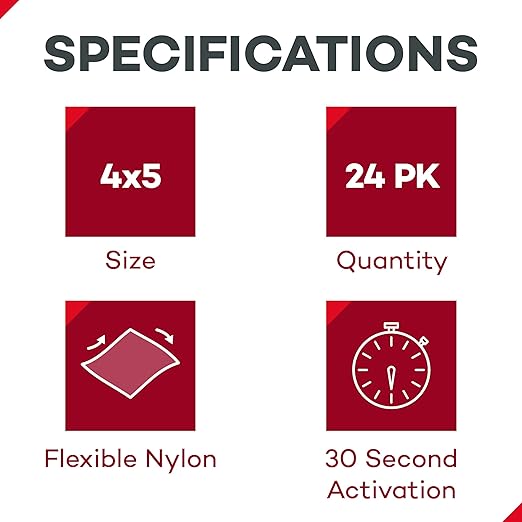 - Multi-Purpose Use: This pack of 24, 4" x 5" disposable instant cold packs are ideal for minor sprains, swelling, burns, muscle soreness, nosebleeds, and headaches. Due to their size, you can use them on knees, hips, head, neck, ankles, elbows, calves, shoulders, and more. Great addition for at home or work first aid kits and also athletic trainer kits for athletes on the go.