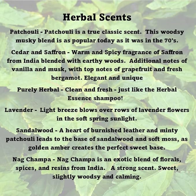 - Total of 6 packages of Herbal scents. One Purely Herbal which smells similar to herbal shampoo, one Lavender, one Cedar and Saffron, one Patchouli, one Nag Champa, one Sandalwood.