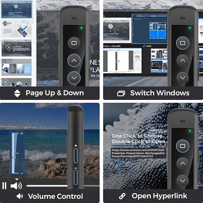 AMERTEER Wireless Presenter Remote – Presentation Clicker with 2.4GHz RF Hyperlink & Volume Control, Built-in Rechargeable Battery, Compatible with Keynote, PowerPoint, Mac, PC, and Laptops