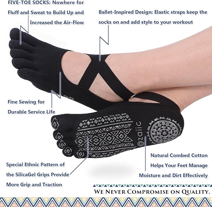 Ozaiic Yoga Socks for Women with Grips, Non-Slip Five Toe Socks for Pilates, Barre, Ballet, Fitness