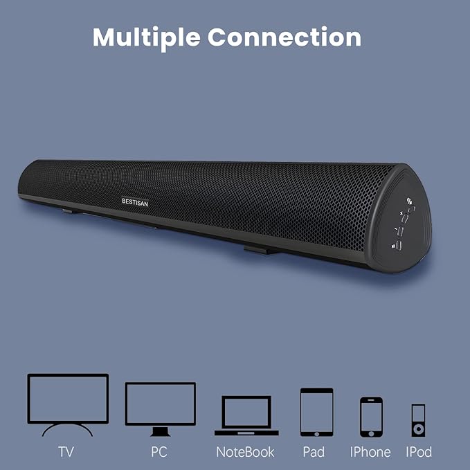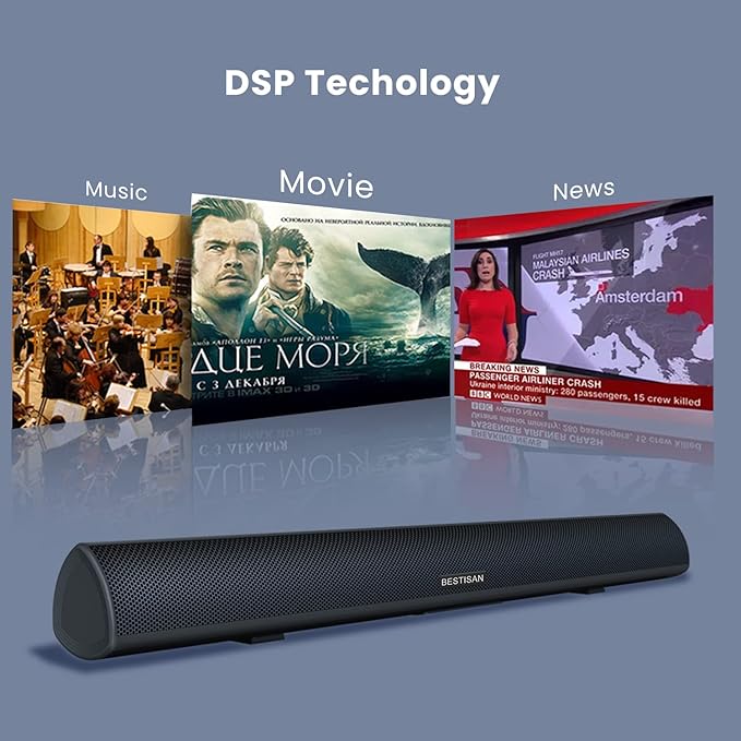 Sound bar, BESTISAN Soundbar Wired and Wireless Bluetooth 5.0 HDMI-ARC Speaker for TV (28 Inches, HDMI-ARC Connection, Optical Cable Included, DSP, Bass Adjustable, Wall Mountable)