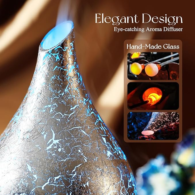 - UNIQUE DECORATIVE AROMA DIFFUSER - Our 280ml glass essential oil diffuser has an hand blown glass with a elegant sliver leaf feature and wood grain decorative base. It is very suitable for your bedroom, living room, children's room, study room, office and yoga room.