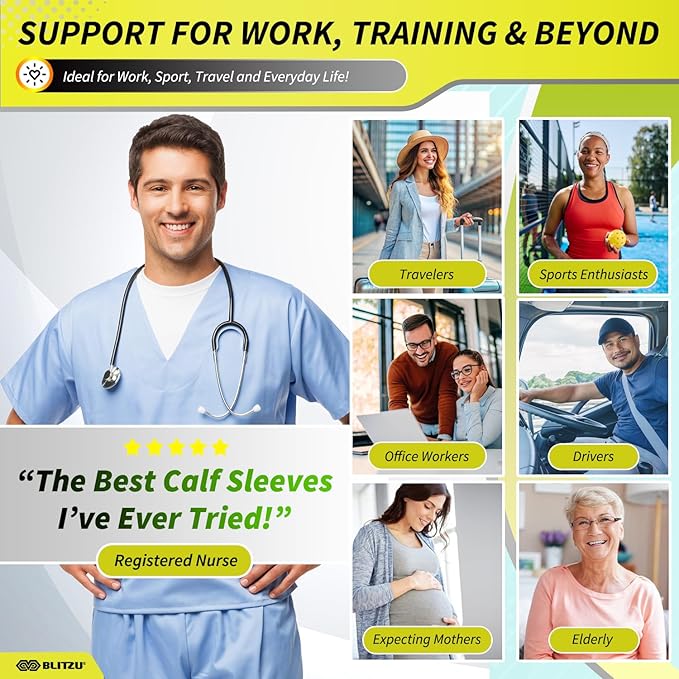 - Effective Compression for Swelling & Varicose Veins Relief: The BLITZU Calf Compression Sleeves feature graduated compression to improve blood circulation, reduce swelling, and alleviate discomfort caused by varicose veins and pregnancy-related leg swelling, making them perfect for nursing mothers and individuals with circulation issues.