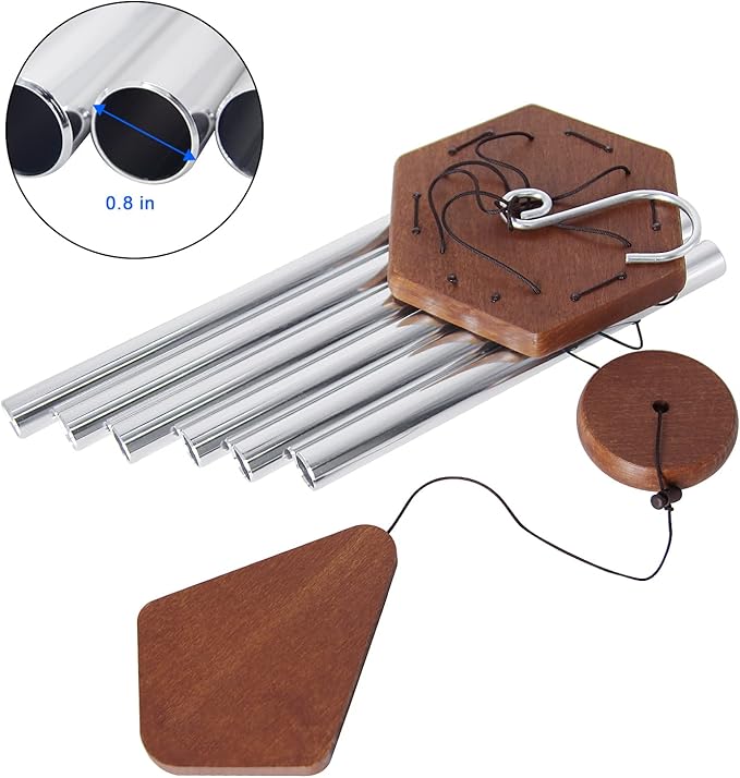 - ♪Wind Chimes Outdoor- 30'' is the best size for your Outdoor and Indoor Decor. This decorative chime comes with a stronger metal hook, easily to hang. The longest tube is 14.3''. 6 aluminum powder-coated tubes are hand-tuned by our professional tuning experts to achieve a superior musical performance. Heavy duty nylon cording high density beech wood striker made from FSC-Certified wood, for a clear tone and resonances. Thick tubing wall creates a longer lasting deep tone. The sound is soft, deep tone and rela