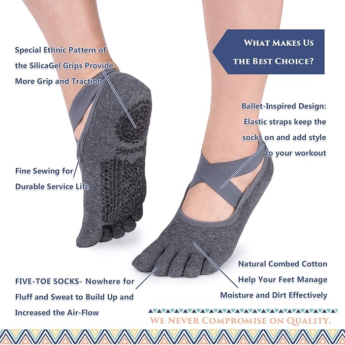 - HOLD YOUR POSE WITH EASE - You will feel confident, stylish and protected with our anti-skid full toe socks. Feel free to move and spread your toes naturally with our full toe grippy socks with the cutest design. If you're looking for socks with strategically placed cushioning and grip by your toes, you can stop the search! They are ideal for Yoga, Bikram, Pilates, Barre, Ballet, Gym, Studio Classes or Dance