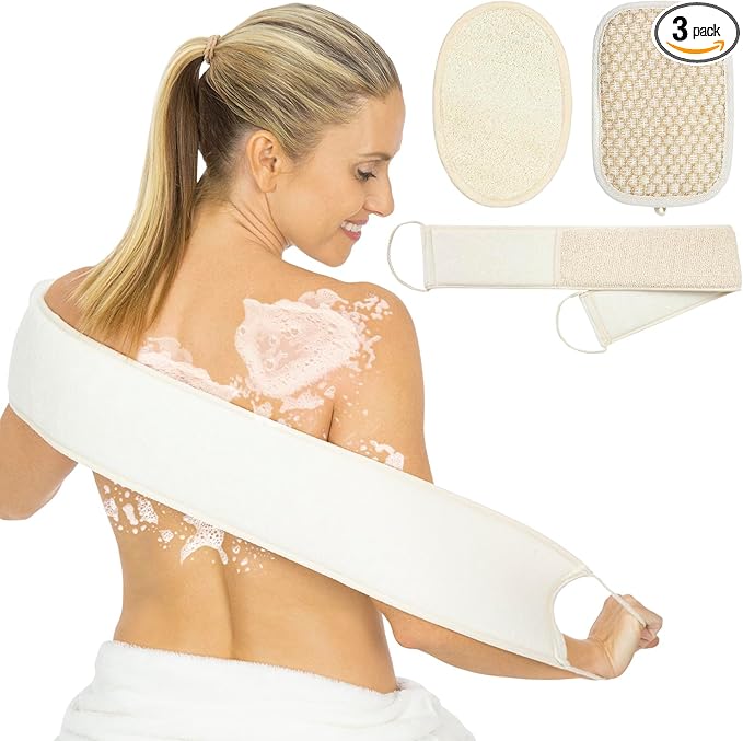 - RAMIE BACK SCRUBBER: Featuring two handles, the belt-style back scrubber measures 35” in length and 5” in width for full back coverage. The ramie belt allows you to easily cleanse hard to reach areas and includes a secure soap pocket. One side of the belt scrubber is made with a medium-coarse blend in ramie loops for effectively removing dead skin cells. The opposite side of the belt is made with soft linen, ideal for sensitive skin types.