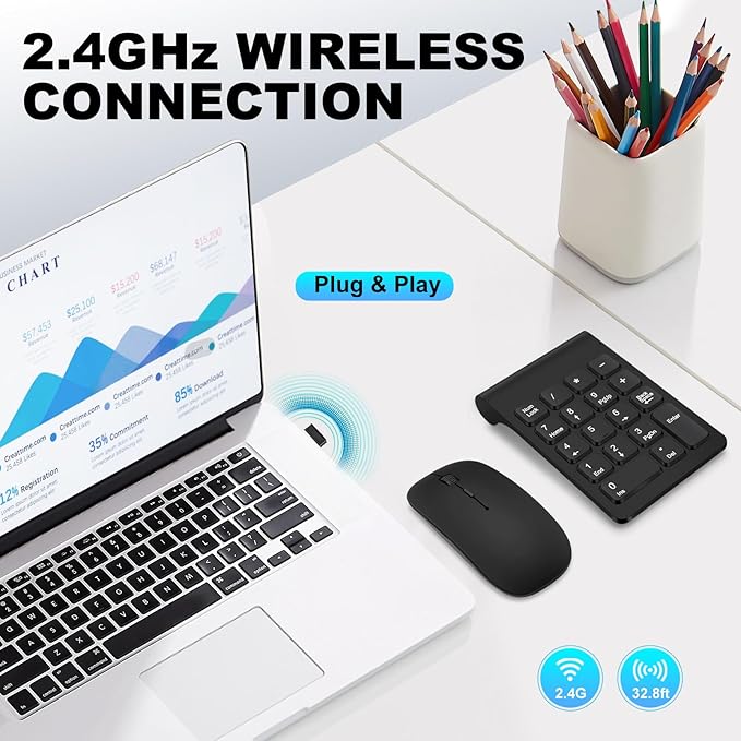 - Included Components : 1 x 18 keys Wireless Numeric Keypad, 1 x Wireless mouse, 1 x 2.4G Wireless USB Receiver