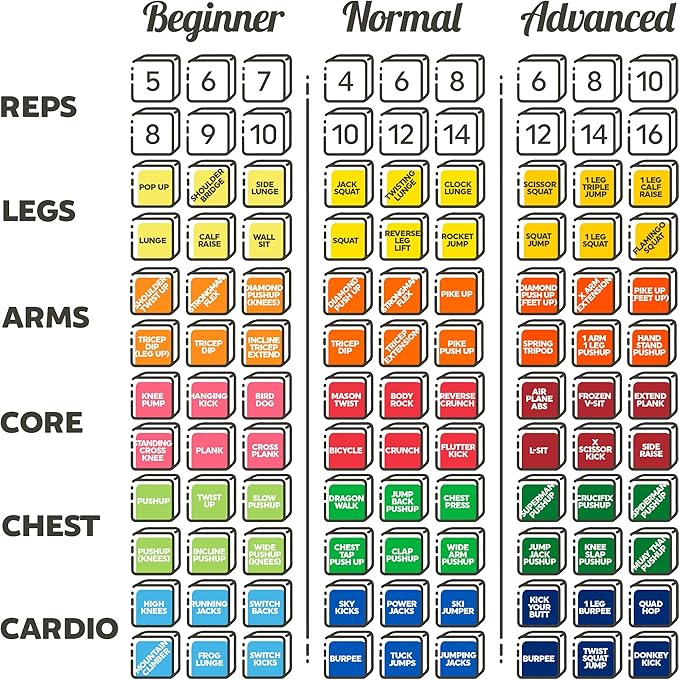 - NORMAL DIFFICULTY SET: Standard colored dice with 30 moderate difficulty and moderate impact exercises. Ideal for most healthy, active individuals.