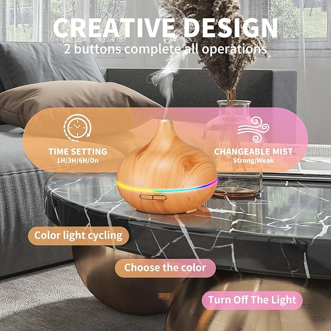 - Auto Shut-off & Large capacity: Ultrasonic Oil Humidifier can hold 550ML water up and run continuously for 10 hours.Just add a few drops of essential oils and you can enjoy a pleasant mood all day long.