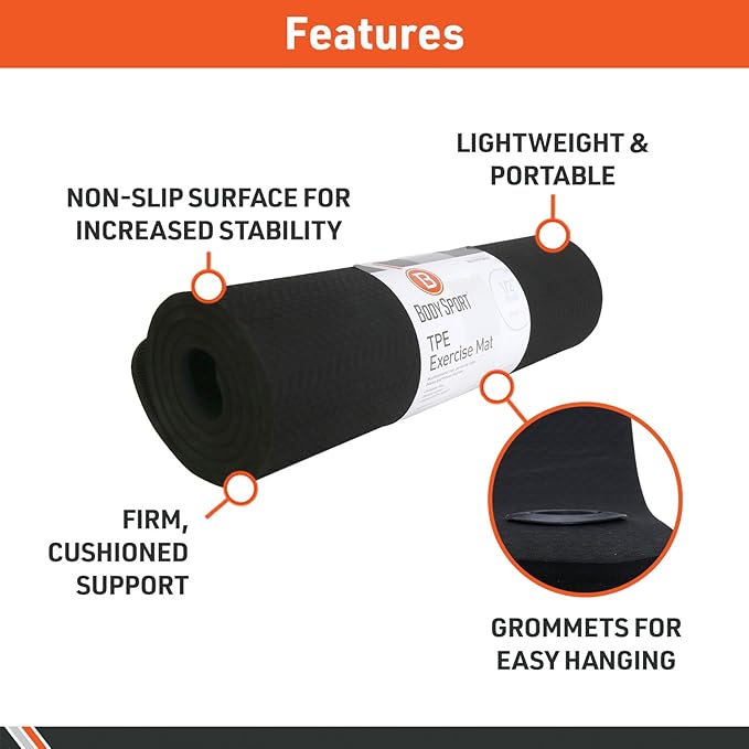 - Perfect for Gyms. BodySport TPE Exercise Mat is the perfect mat for gyms due to its thickness and easy-grip, textured material. Gym members can use this fitness mat for yoga, pilates, stretching, push-ups, squats, and more!