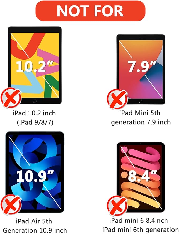 - Not fit iPad 10.2 inch/iPad Air 10.5 inch/iPad Pro 10.5 inch/iPad Pro 12.9 inch/ iPad 2/iPad 3/iPad 4 and any other model
