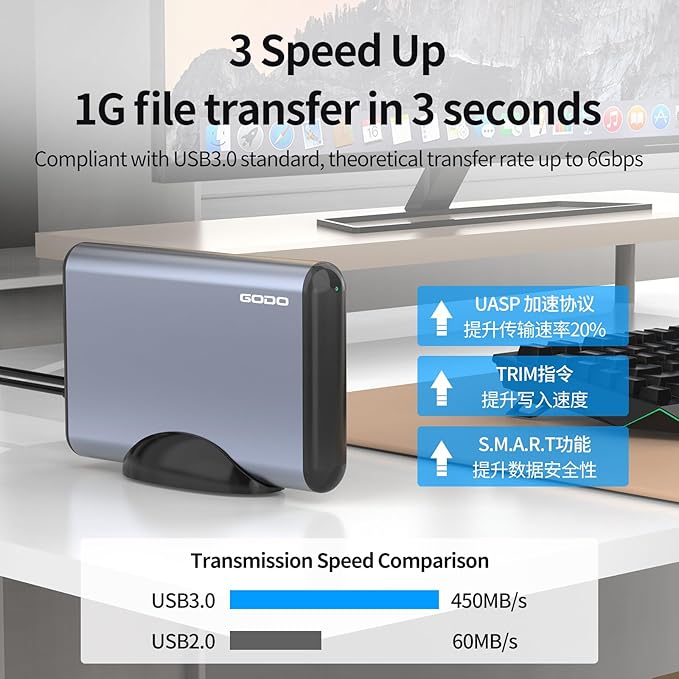 - 【Ultra Fast Speed Transmission】The data transfer speed of GODO 3.5'' SATA HDD SSD external hard drive enclosure/hard drive case up to 5Gbps and support UASP and Trim protocol, 80% faster read speeds compared to traditional port. The USB 3.0 interface with super speed performance can improve the user's experience.