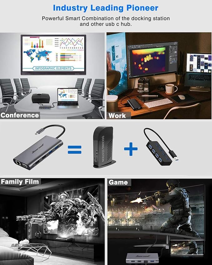 - Industry Leading Technology: Hiearcool intelligent USB C Hub incorporates a triple display, lightweight, portable and powerful with multi-ports to achieve multi-display (mirror mode/extend mode/video wall mode)
