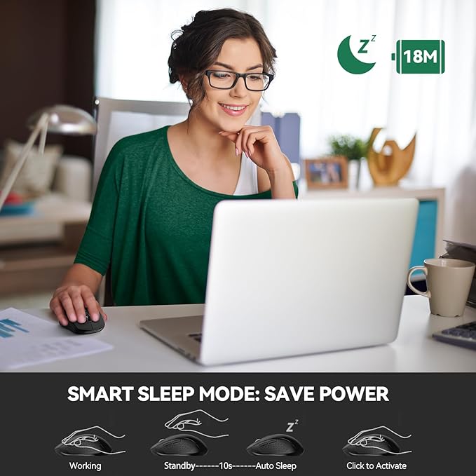 - Long Battery Life & Extremely Low Power Consumption: The bluetooth mouse has an 18-month long battery life (battery not included), with an auto power-off function to save power, the bluetooth mouse will enter sleep mode in a few minutes of inactivity. Press any button to wake it up. Note: The wireless mouse for laptop is powered by 1x AA batteries (not included).
