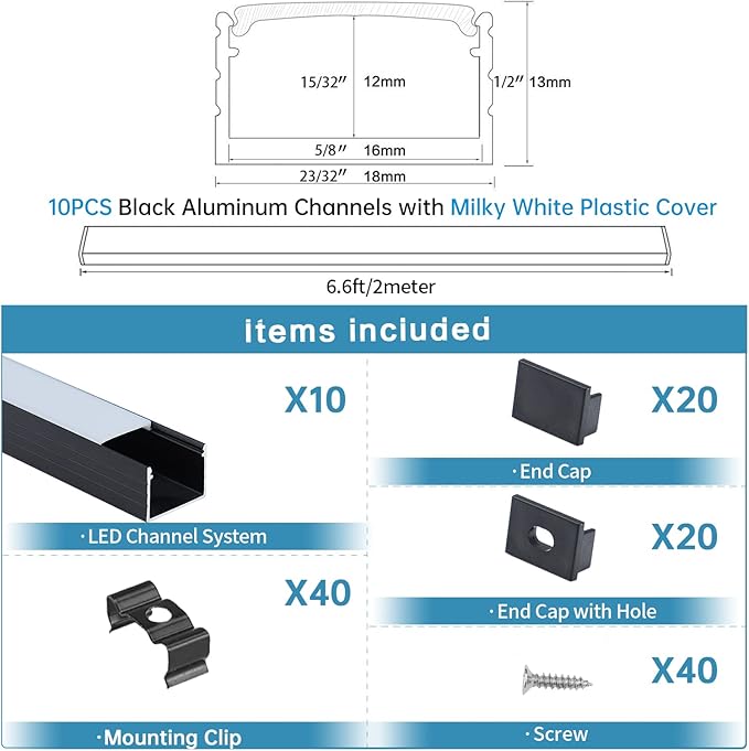 - Quality Guarantee: Muzata aluminum LED strip channel is anodized extruded, great in heat dissipation, while the LED cover protects the LED strip from dust and physical contact, prolonging the lifespan of light strips. This package includes 10pcs black LED channel, 10pcs milky LED cover, 40pcs end caps,40pcs mounting clips,40pcs screws. Each led channel segment is 2M (6.6ft), total is 20M/66ft. Please reach us if you need after-sales service
