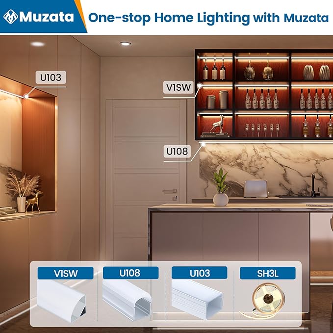 - Personalized Choices: Muzata is a professional manufacturer who provides various LED channels systems for customers to choose from. Classic regular LED channel- Muzata U1SW, LED channels with the best spotless effect in the market- Muzata U108, fits waterproof light strips- Muzata U103, V-shaped channel- Muzata V1SW, plaster-in channels- Muzata U117, silicone channels- Muzata USC2 USC4