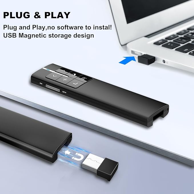 - Plug & Play and Easy to Operate: The presenter mouse is multi-functional: Move your hand in the air to mark / Erase, adjust volume, Play/Pause audio or video by air mouse, Full/ Black Screen, Page Up/ Down etc. No need to install any software, just plug the USB receiver into the USB port of your computer