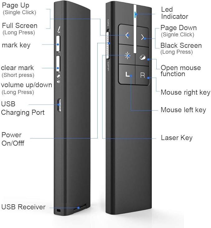 - Rechargeable & Long Control Range: ①Built-in 300mAh rechargeable battery, the presentation remote provides can work for weeks by 2 hours full recharge. ②The wireless control range of the PowerPoint clicker has been upgrated to 50M/164FT
