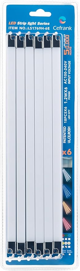 - Cool White (6000K) LED Strip Lights Kit : (6) 12’’ LED light bars + rocker switch+ UL-Listed A/C Power adapter . Per light bar costs only 1.2 Watt, 18pcs High intensity SMD, 120 lumens output