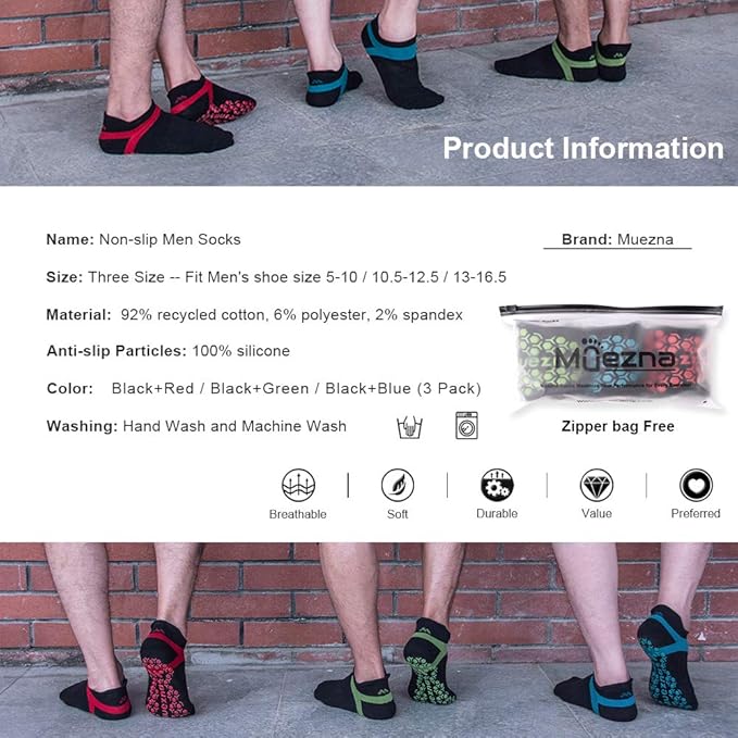Muezna Men's Non-Slip Yoga Socks, Anti-Skid Pilates, Barre, Bikram Fitness Hospital Slipper Socks with Grips