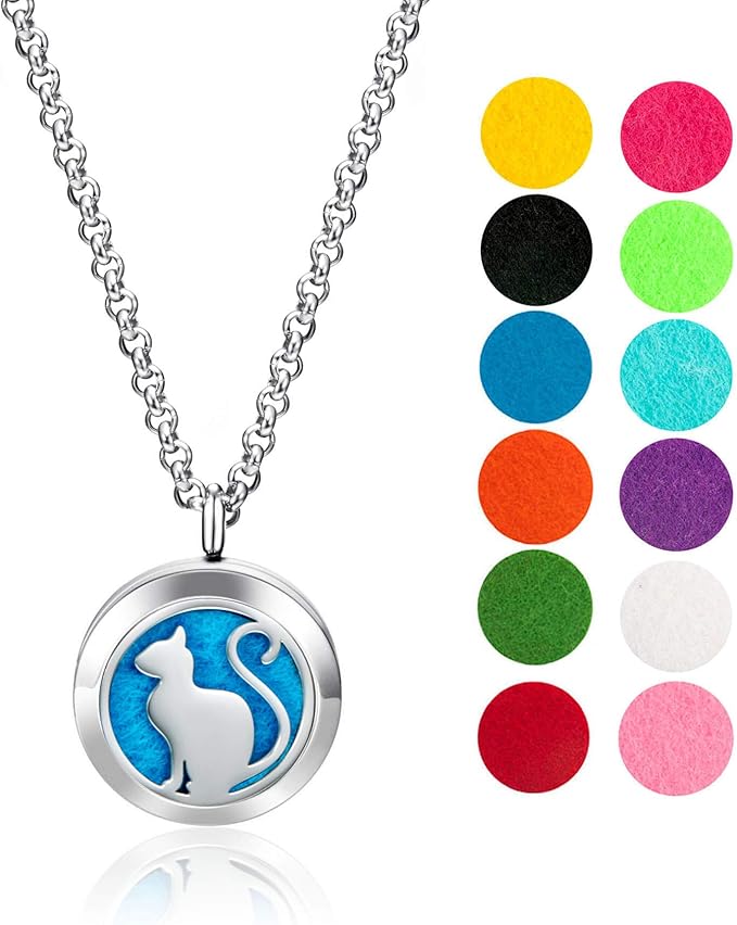 - Fashion-Forward and Functional: Stylish and versatile, we pair our one inch Pretty Kitty Cat diffuser locket with a gorgeous 24 inch chain and 12 vibrant colored refill pads! Complete with a solid back and a secure closure, you’ll never have to worry about getting oil on your clothing.
