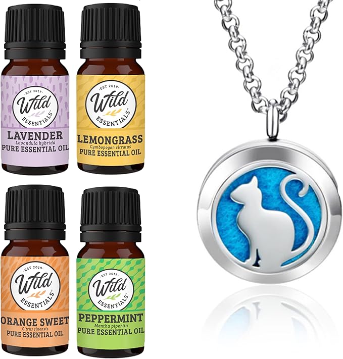 - ESSENTIAL OIL DIFFUSER NECKLACE: This Holiday, give the original Pretty Kitty Cat essential oil necklace diffuser gift set from Wild Essentials. This ready to use, all in one box set includes everything you need to use it immediately! Four 5ml bottles of essential oils (lavender, lemongrass, orange and peppermint), a Tree of Life necklace and 12 different colored 17mm refill pads.