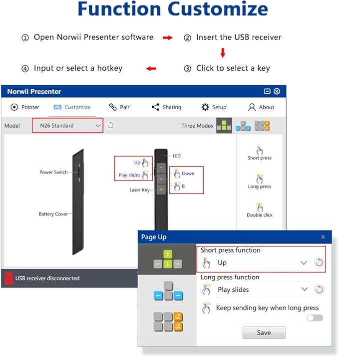 - Functions and Customization - This Wireless Presentation Clicker supports Black/Full screen, Page forward/ backward. You can reconfigure the key's function via Norwii Presnter software. You can switch the function of the Back and Next button between up&down, Pgup&Pgdn, Left/right, Scroll up/down by long pressing the two buttons for 3 seconds.