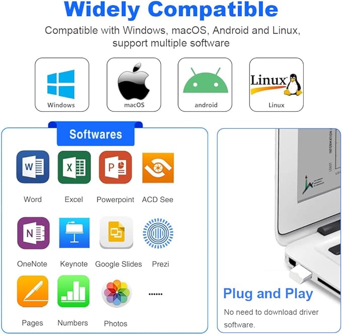 - Wide Compatibility - This pointer for presentations is compatible with Windows, macOS, Linux, Android and leading presentation software like PowerPoint, Keynote, Prezi, Google slides and more.