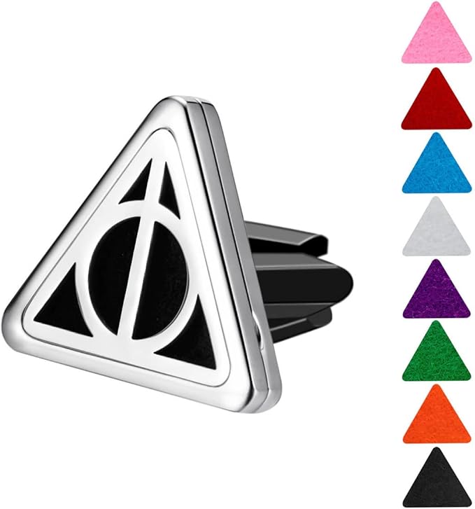 - Fashion-Forward and Functional: Stylish and versatile, we pair our one and a quarter inch Potter Hallows diffuser locket with 8 vibrant colored 25mm refill pads! Complete with a vented back for air flow, a 4 way rubber coated vent clip to fit vertical or horizontal vents and two magnets for a secure close.