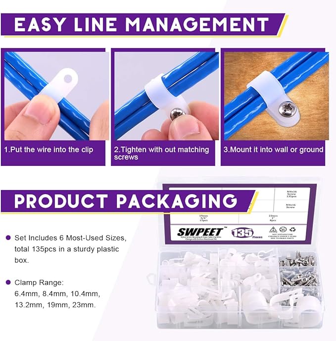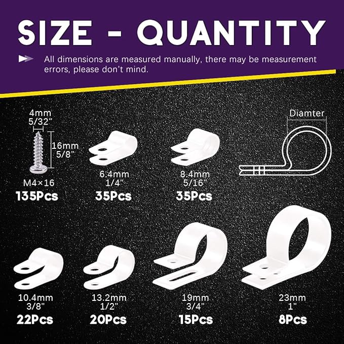 - ❤【Diverse size】--- Suitable for most common size wires,There are six types of wire selectable sizes: 6.4mm(1/4''), 8.4mm(5/16''), 10.4mm(3/8''), 13.2mm(1/2''), 19mm(3/4''), 23mm(1''). A total of 135 clips.