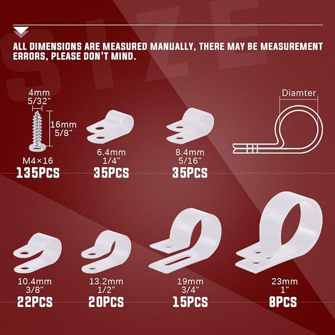- ✔[PRACTICAL Cable Clamp] You will get White clips 35pcs-6mm(0.23in), 35pcs-8mm(0.31in), 22pcs-10mm(0.39in), 20pcs-13mm(0.51in), 15pcs-19mm(0.74in), 8pcs-23mm (0.9in) and 135 pcs matching stainless screws M4*16. These cable clips are suitable for most common size wires.