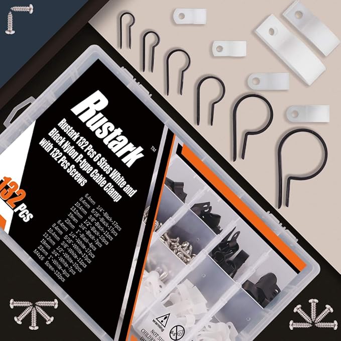 - 👍【6 Size Assortment Kit】The set contains 6 size in white and black color: 6.4R(1/4’’),8.4R (5/16’’), 10.4 R(3/8’’),13.2R(1/2’’), 19R (5/8’’), 23R( 1’’), coming with M4.2*16 screws. 132 Piece R-type cable clip cord organizer and 132 piece screw, totally 264 piece.