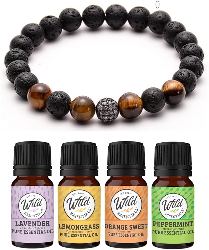 Wild Essentials Tiger Eye Lava Stone Essential Oil Diffuser Bracelet, Expandable up to 8 inches, Aromatherapy Jewelry Gift Set and 100% Pure Oils (Lavender, Lemongrass, Orange and Peppermint)
