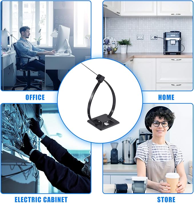 - Complete Cable Management Set: Enhance your space's organization with our extensive cable management set, which includes 100 sturdy 0.9" x 0.9" black adhesive mounts along with 100 strong 7.8" x 0.12" black nylon zip ties, perfect for securing and managing wires efficiently.