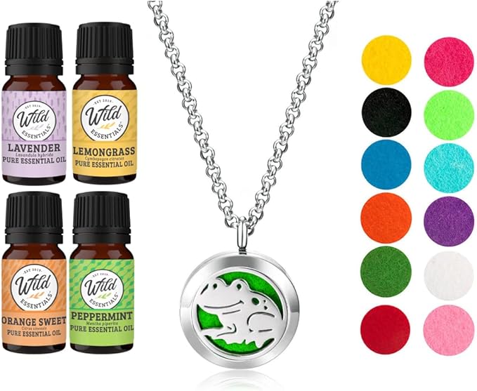 - ESSENTIAL OIL DIFFUSER NECKLACE: This Holiday, give the original Happy Frog essential oil necklace diffuser gift set from Wild Essentials. This ready to use, all in one box set includes everything you need to use it immediately! Four 5ml bottles of essential oils (lavender, lemongrass, orange and peppermint), a Happy Frog necklace and 12 different colored 17mm refill pads.