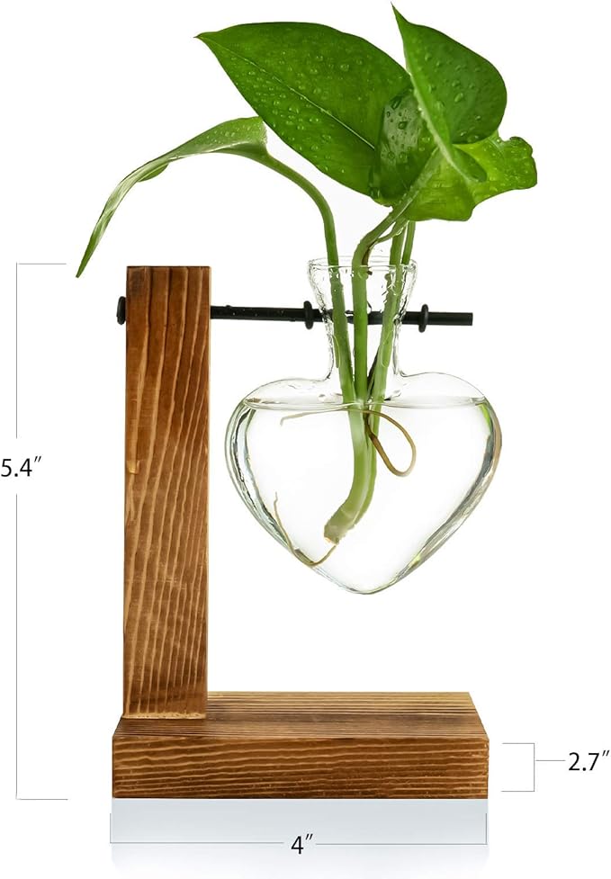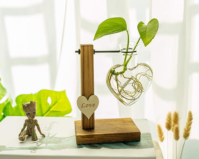 Kingbuy Hydroponic Glass Vase Vintage Desktop Plant Terrarium Planter Bulb Vase Water Planting Propagation Vase Planters Hydroponics Plants with Retro Wooden Stand Home Garden. (D(1 Heart Vase))