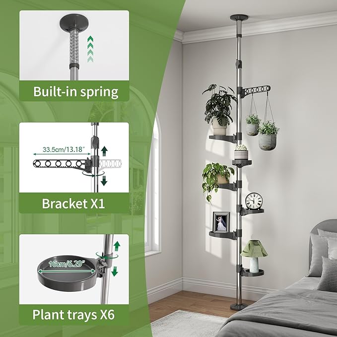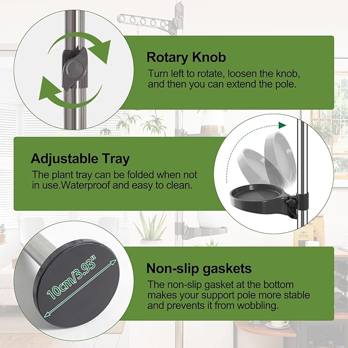 - ADJUSTABLE DESIGN: The height of this plant pole can be adjusted by pull out the pipe, from 230 to 290cm (7ft6in to 9ft6in); the angle of the plant trays and hanger can be rotated 360 degrees, and the height can also be adjusted vertically. Perfect for organizing your beloved plants and flowers.