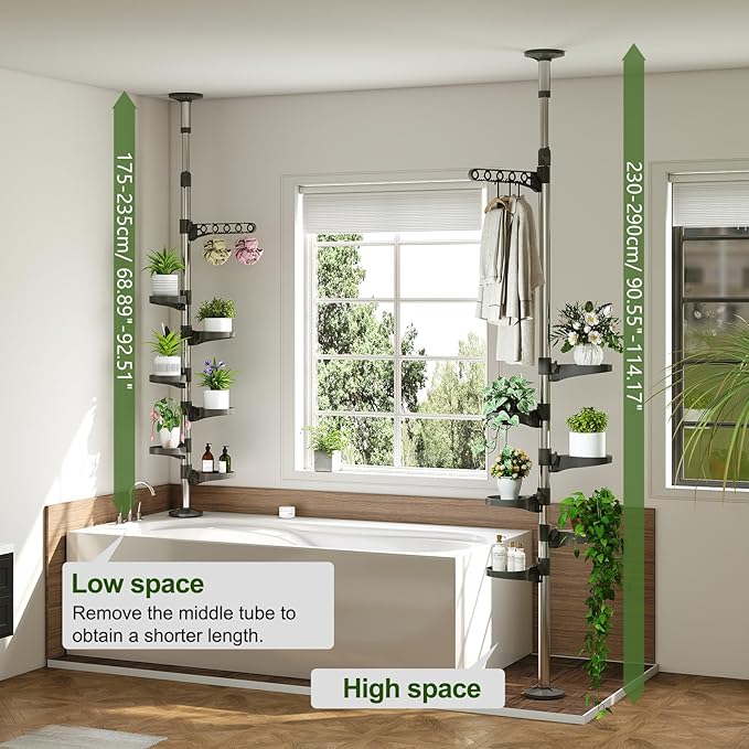 - MULTI-FUNCTIONAL: Rust-proof tension pole adjustable plant stands/flower racks/ bathroom shower storage shelf/ clothes hanging rod, allows indoor/balcony/window use, designed for plant hangers, flower pots display and clothes hanging. Built-in spring design on the top part, can easily move the location, durable and stability.