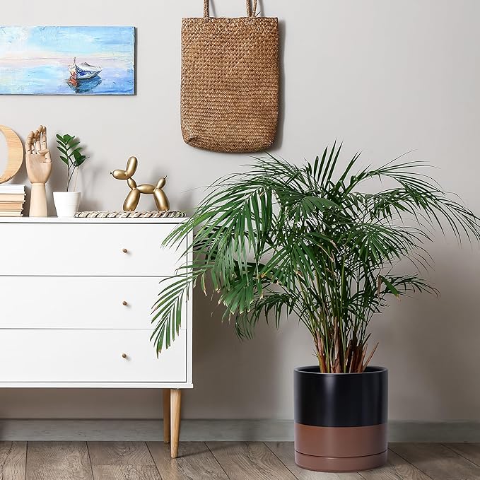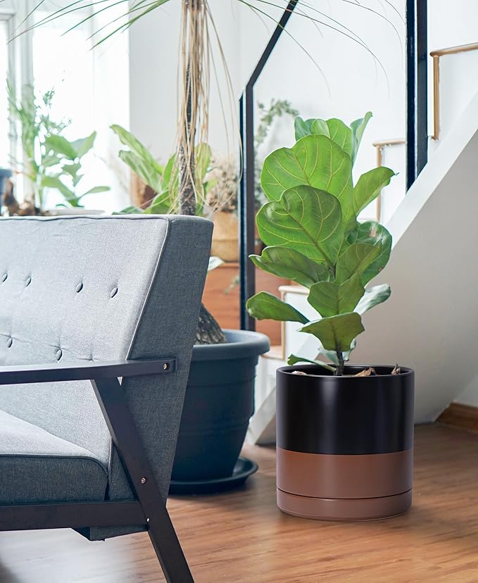 D'vine Dev 10 Inch, Ceramic Planter Pot with Drainage Hole and Saucer, Indoor Cylinder Round Planter Pot, Black/Speckled Tan, 94-O-E-7