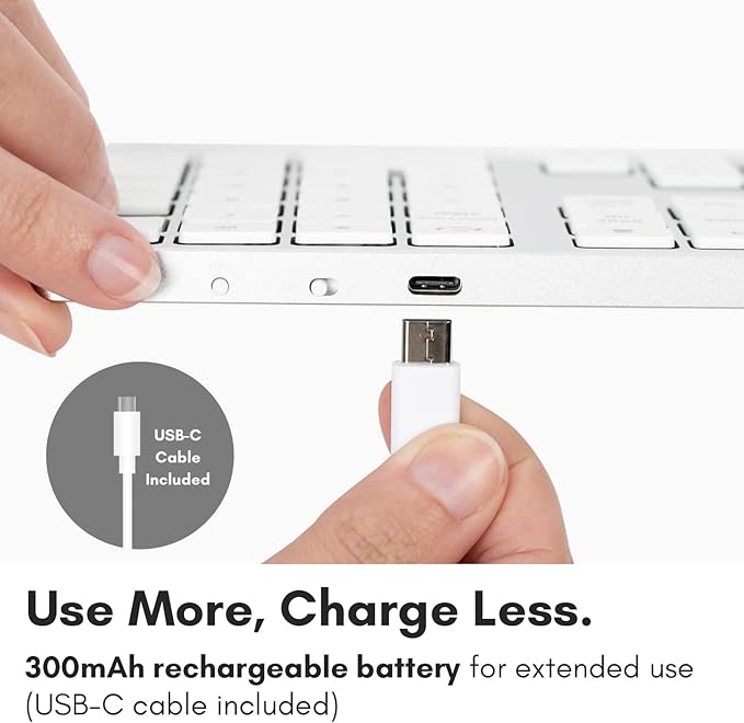 - Long-Lasting Rechargeble Battery: The wireless keypad features a built-in 300mAh rechargeable battery that lasts up to 1 month. Charge via USB-C port (cable included). There is also an ON/OFF switch to save battery life.