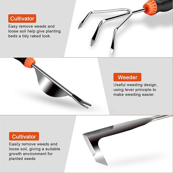- 【Versatile Garden Accessories】 For all your household planting needs, these eight types of hand tools are extremely helpful. This stainless steel garden tool includes every detail you require, from weeding and digging up to aerating the ground and transplanting. Bringing your gardening dreams to life with the help of your natural thumb.